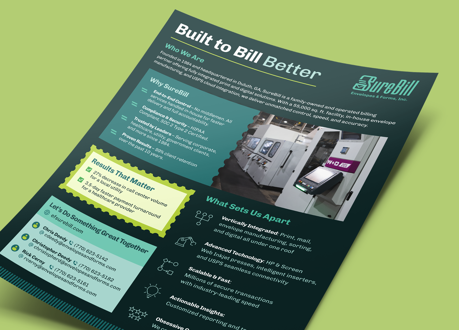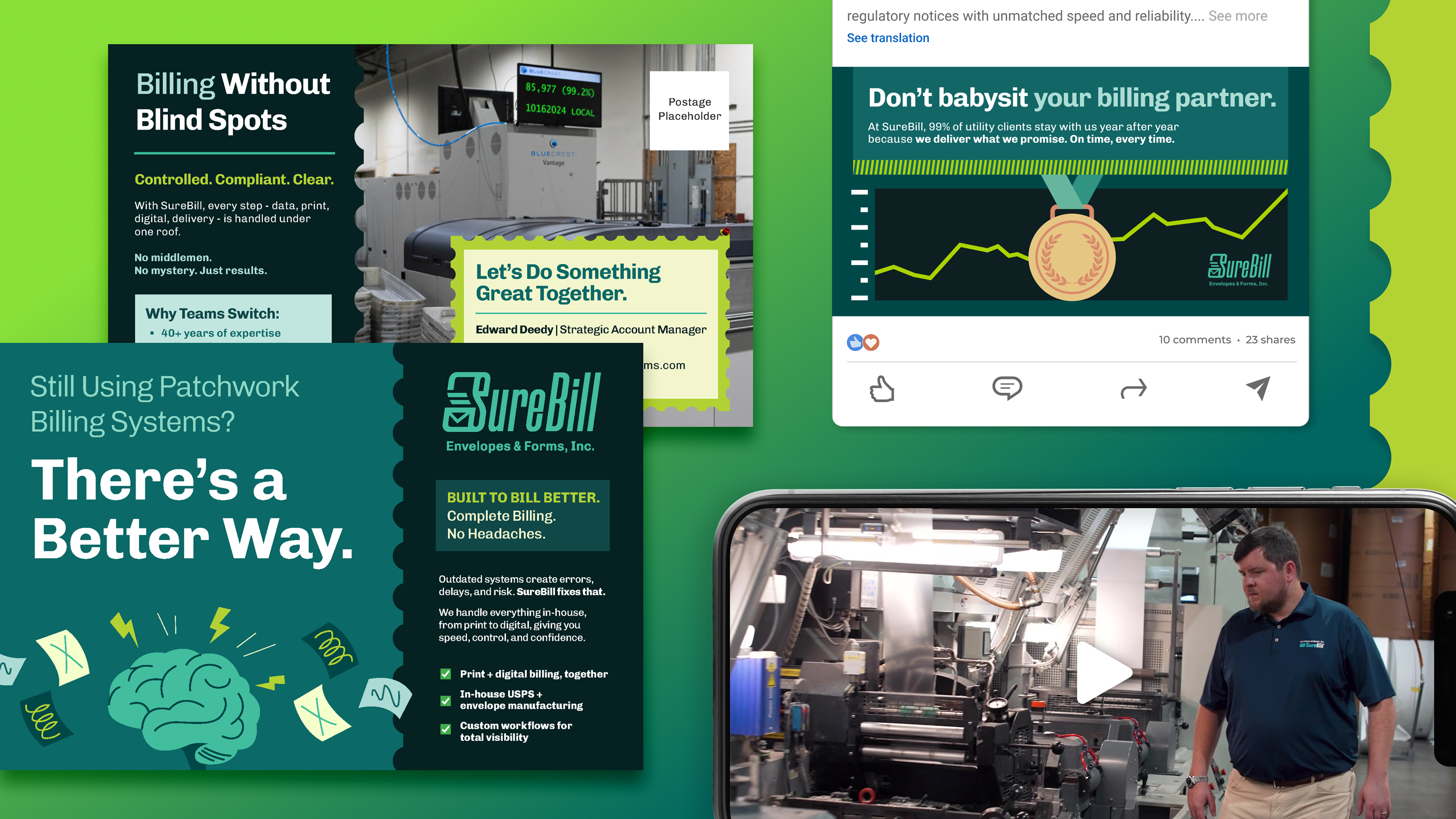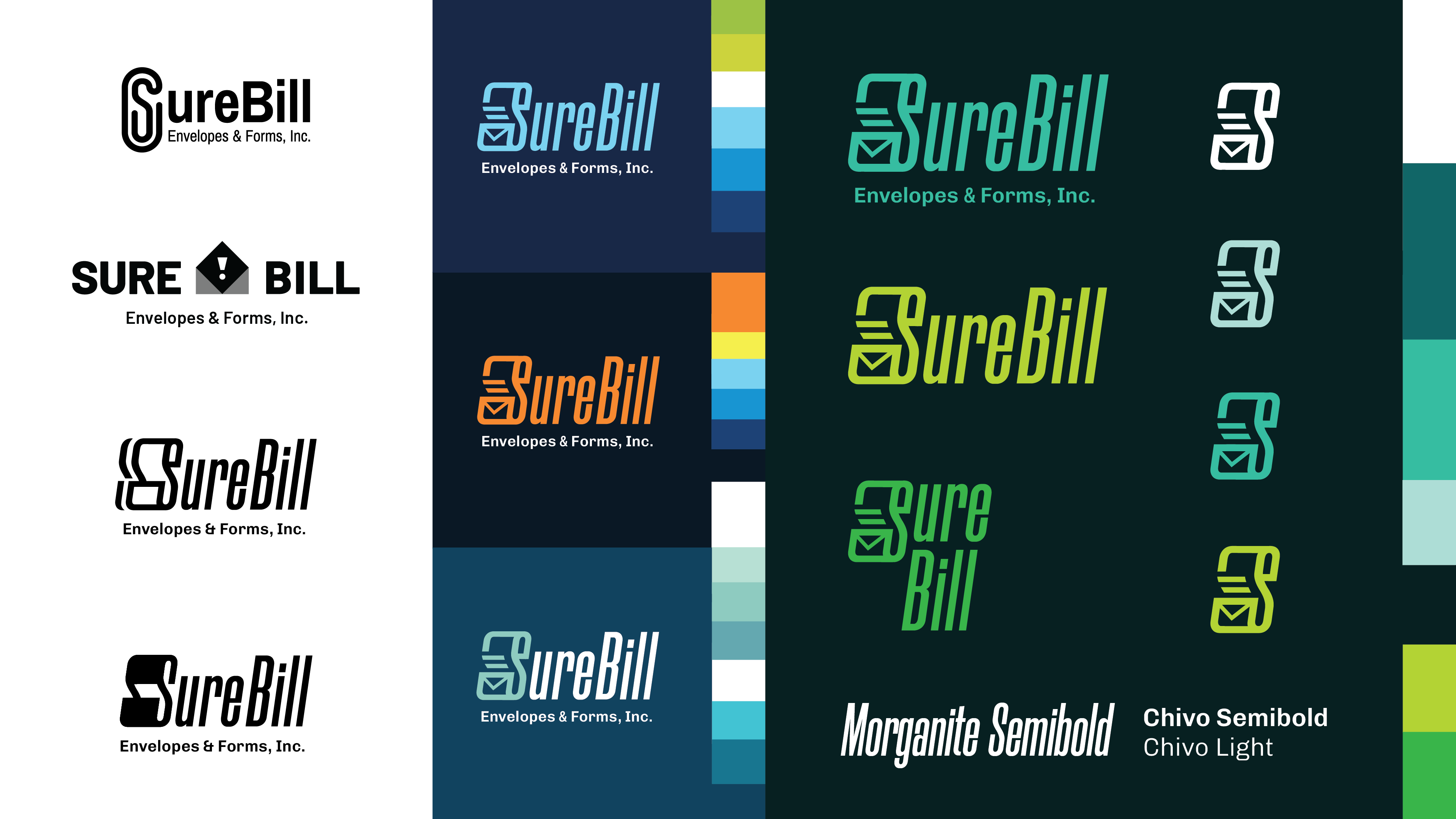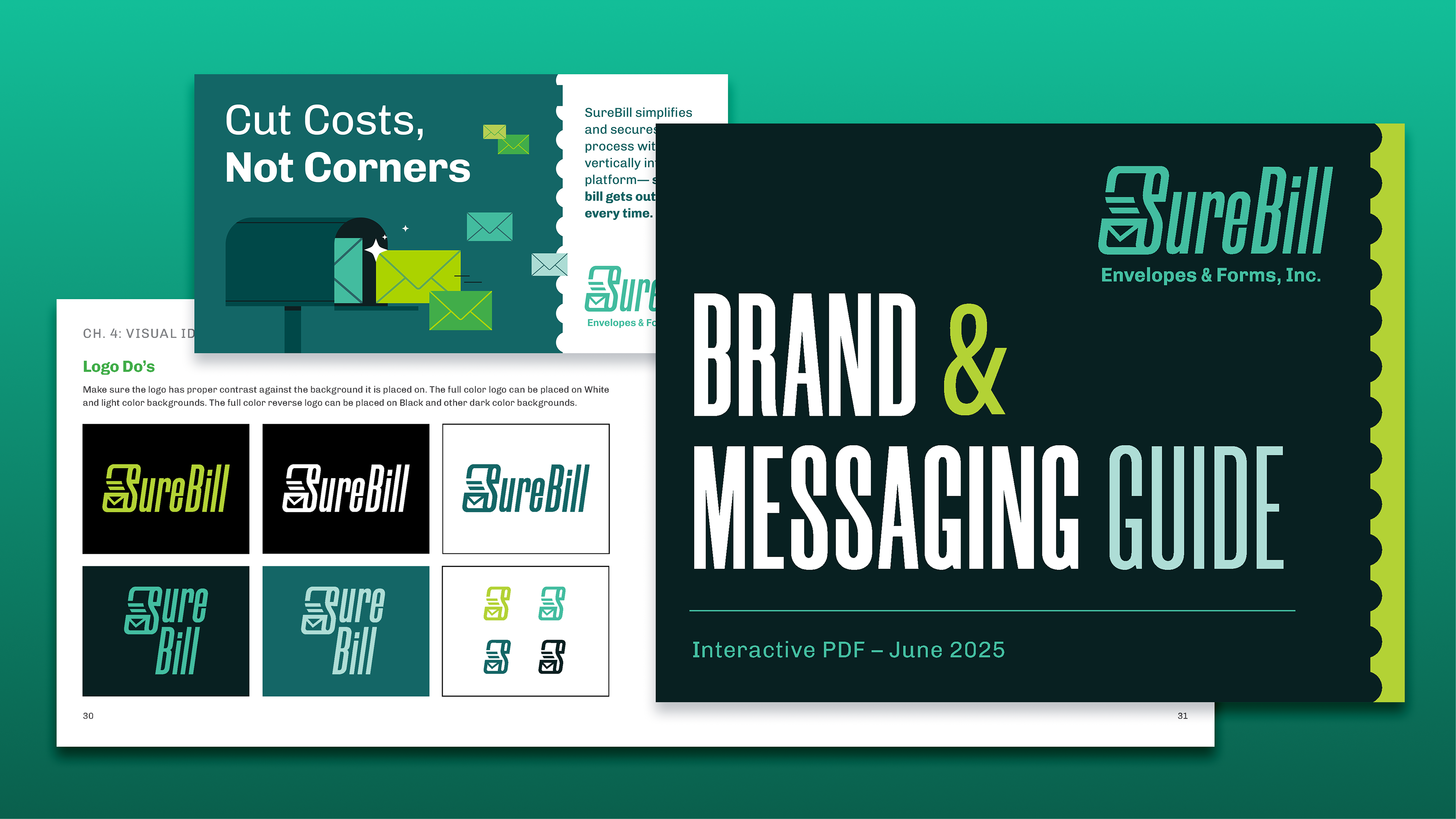 At Between Pixels, we redesigned SureBill Envelope & Form's logo and brand identity to convey both the print and digital sides of services. This update visually reflects how the company stand outs: being the only vertically integrated billing partner in their industry. The logo mark shows the physicality of their printing process, while emphasizing speed and efficiency. This branding has been applied to integrated campaigns and their website.