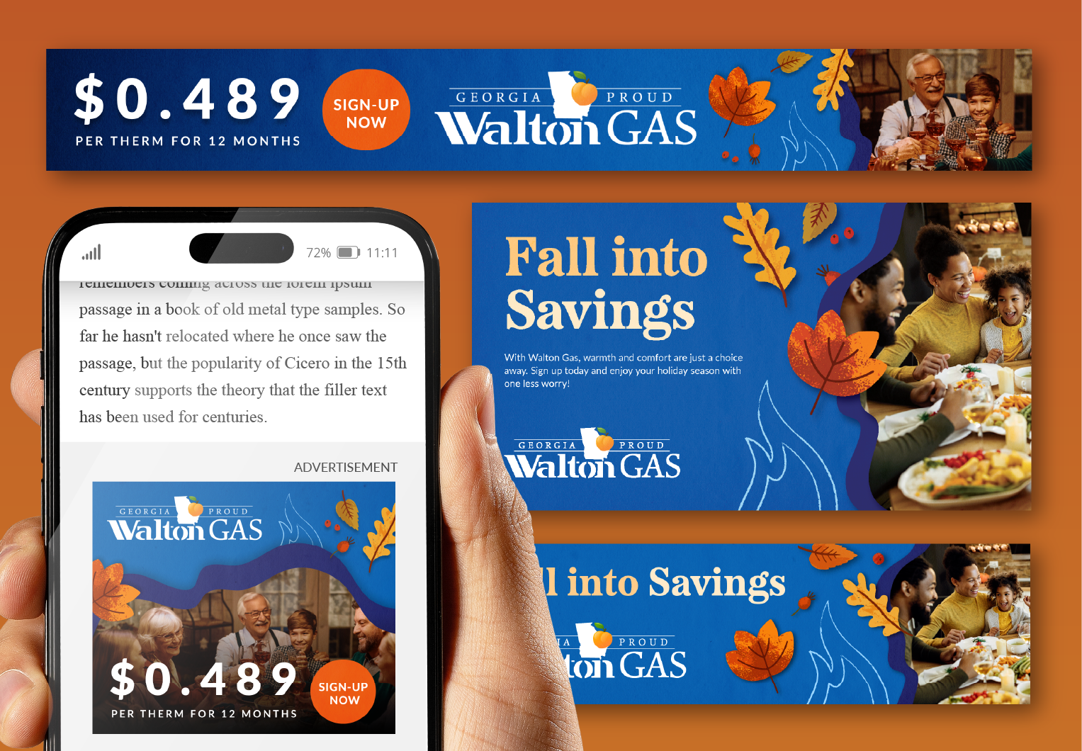 Walton Gas' brand emphasizes Charity, Service, Convenience, and Consistency to show their warmth for the community. At Between Pixels, I create the overarching look for annual and seasonal campaigns, producing print and digital advertisements that visually communicate their brand values.